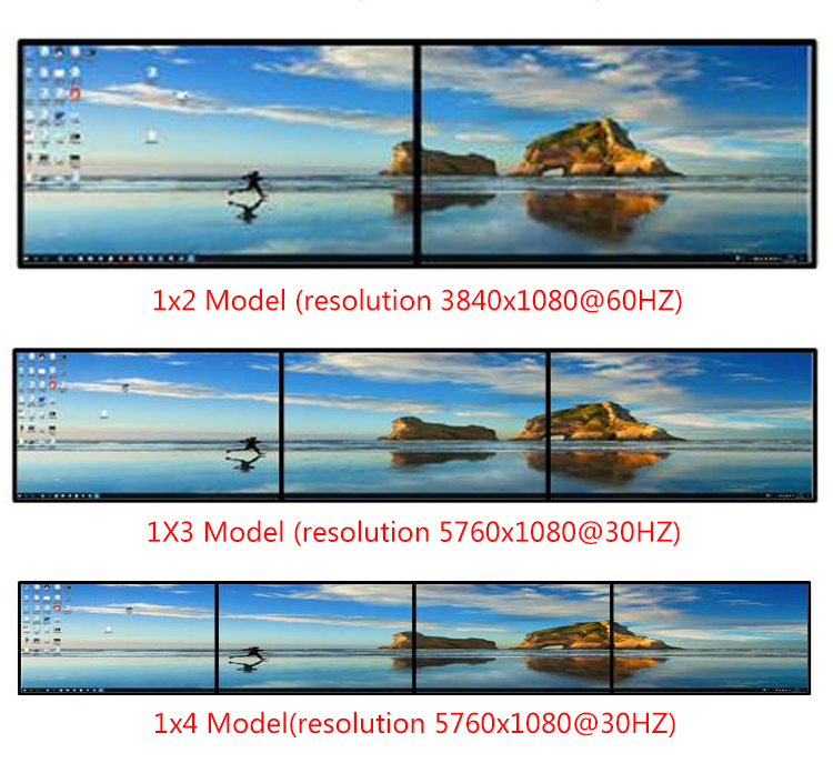 采用模塊化設計,單機可定制2至24畫面拼接,如常用的1x2畫面拼接、2x2四畫面拼接、2x3或3x2六畫面拼接、2x4八畫面拼接、3x3九畫面拼接、2x5十畫面拼接、3x4十二畫面拼接等。